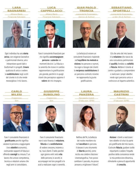 Oltre i numeri, i mercati e le strategie d’investimento, esiste un mestiere fatto di ascolto, empatia, fiducia e responsabilità. Una professione che sa unire la mente e il cuore, la tecnica e l’umanità. Tutto è partito da una lettera arrivata giorni fa in redazione (redazione@bluerating.com ndr), quella di un consulente che si è definito – con semplicità e sincerità disarmanti – “il consulente più felice del mondo”. Le sue parole, pubblicate sul nostro sito Bluerating.com, hanno acceso una scintilla. Perché dietro i portafogli e i lustrini degli operatori del settore, ci sono persone che ogni giorno accompagnano i propri clienti nelle scelte più delicate, costruendo fiducia e benessere nel tempo. Abbiamo quindi deciso di raccogliere quella felicità, di darle un volto e una voce, chiedendo a consulenti, uomini e donne, di alcune delle principali reti italiane di raccontarci in poche battute perché è bello fare il consulente finanziario.