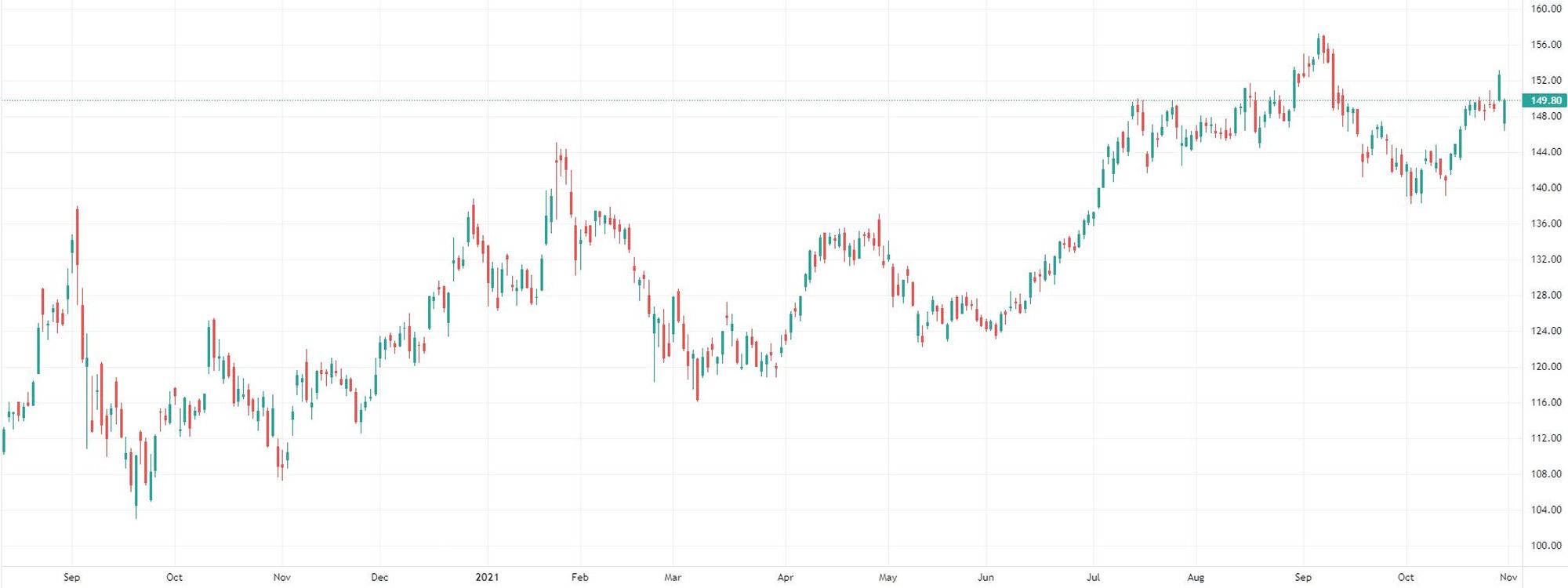 Le azioni Apple hanno effettuato la falsa rottura del livello orizzontale a 150 dollari, ereditato dai massimi del 15 luglio 2021. La discesa potrebbe ora portarsi a ridosso del sostegno a 144 dollari. Un’accelerazione sopra i 150 dollari avrebbe la possibilità di riportare i prezzi verso la zona dei 160 dollari, dove passa la linea di tendenza che collega i massimi del 2 settembre e 25 gennaio 2021.