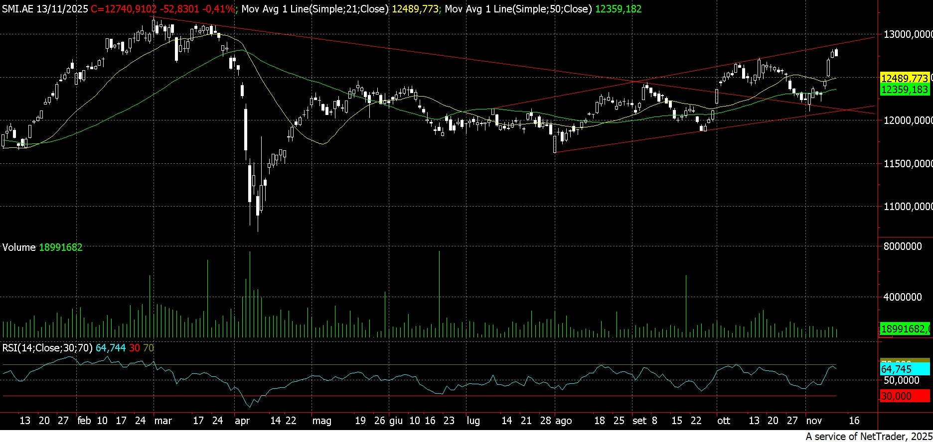Segnali di forza per l’indice Smi, benchmark per l’azionario svizzero: ilpaniere elvetico ha di recente confermato l’incrocio al rialzo della media mobille a 231 sedute passante per 12.490 punti oltrepassando poi la resistenza statica a 12.690 e proseguendo così nel movimento all’interno del canale ascendente iniziato a fine agosto.