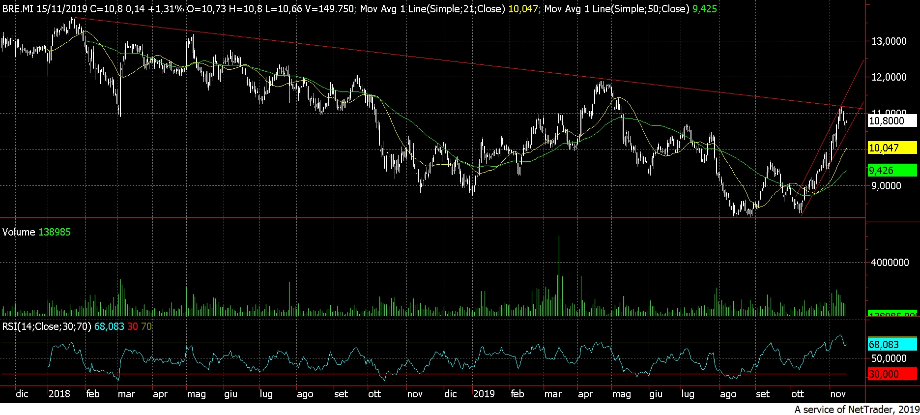 Brembo appare graficamente inserito in un canale ascendente che di recente ha spinto il titolo a testare a 11,15 euro la trendline discendente che da gennaio dello scorso anno impedisce ai corsi di intraprtendere uno stabile e duraturo uptrend.