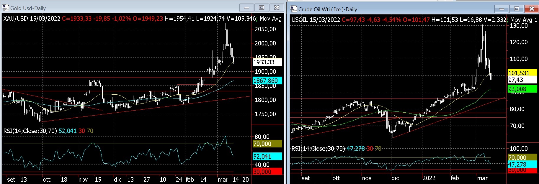 Mentre la guerra in Ucraina si inasprisce sempre più e rischia di innescare una pericolosissima escalation mondiale, oro e petrolio accusano all’unisono (come è possibile notare nel grafico sottostante) una correzione dopo i recenti massimi.