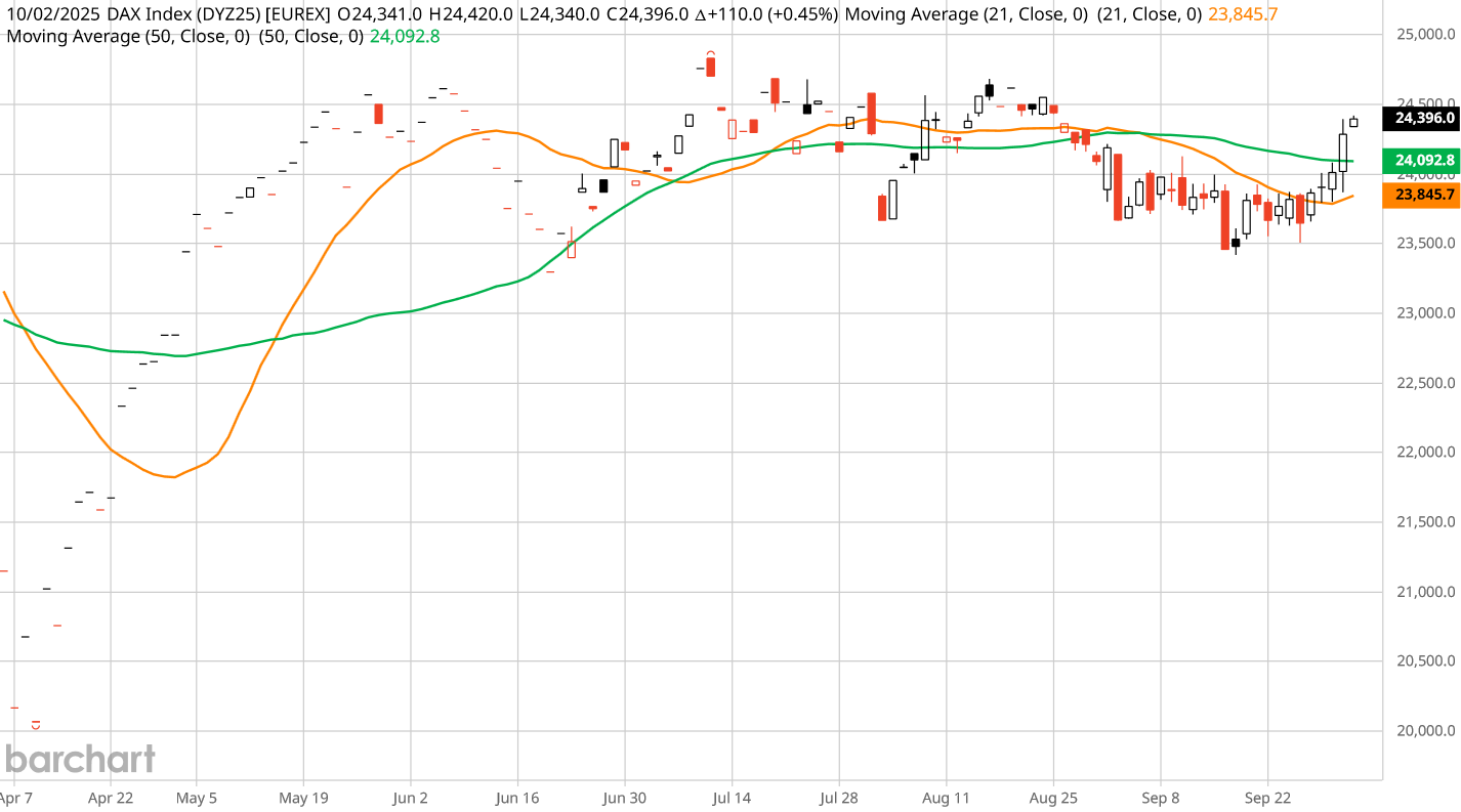 Colpo di reni per il Dax future con scadenza dicembre, salito di slancio oltre la media mobile a 50 sedute passante per 24.090 punti. Operativamente, al rialzo, ora i prossimi potenziali target sono individuabili prima a quota 24.500, poi a 24.685 e ancora nel caso sul top a 24.830. Sotto 24.090, per contro, primi obiettivi in zona 23.845, dove transita la media mobile a 21 sedute.