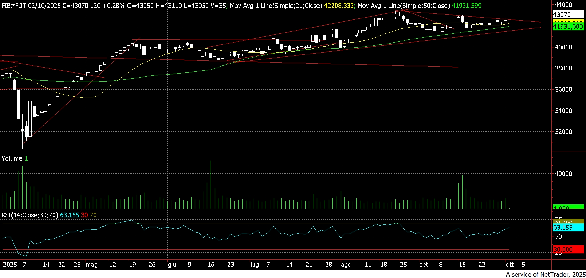 Il Fib, il future sull’indice Ftse Mib con scadenza dicembre, ha oltrepassato a 42.650 punti la trendline discendente che dalla fine dello scorso agosto agosto impediva ai corsi di proseguire nell’uptrend di fondo iniziato nelle ultime sedute di giugno. Dal punto di vista operativo, al rialzo i prossimi target sono ora individuabili a 43.420 prima e in zona 44.000 punti eventualmente in seguito. Al ribasso invece, sotto 42.650, primo targetin zona 42.000.