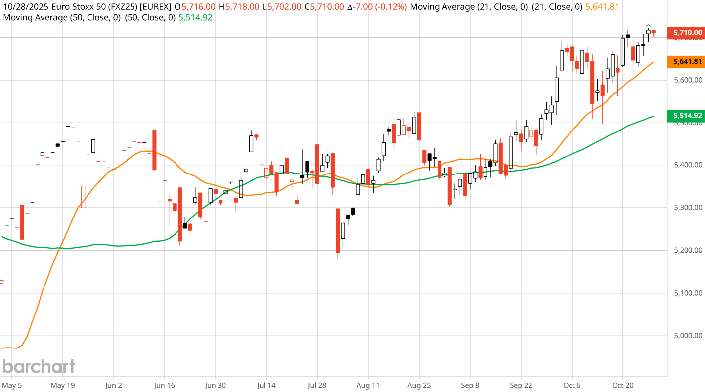 L’Euro Stoxx 50 future con scadenza dicembre, è salito fino a testare il precedente top a 5.720 punti. Essenziale ora per la continuazione dell’uptrend un repentino soprpasso anche di questo ostacolo, pena la formazione di un “pericoloso” doppio massimo, figura tecnica che in genere annticia una correzione dei corsi. Operativamente, oltre 5.720 target potenziali in zona 5.775/800 punti. Al ribasso invece obiettivi potenziali in area 5.660/610 punti.
