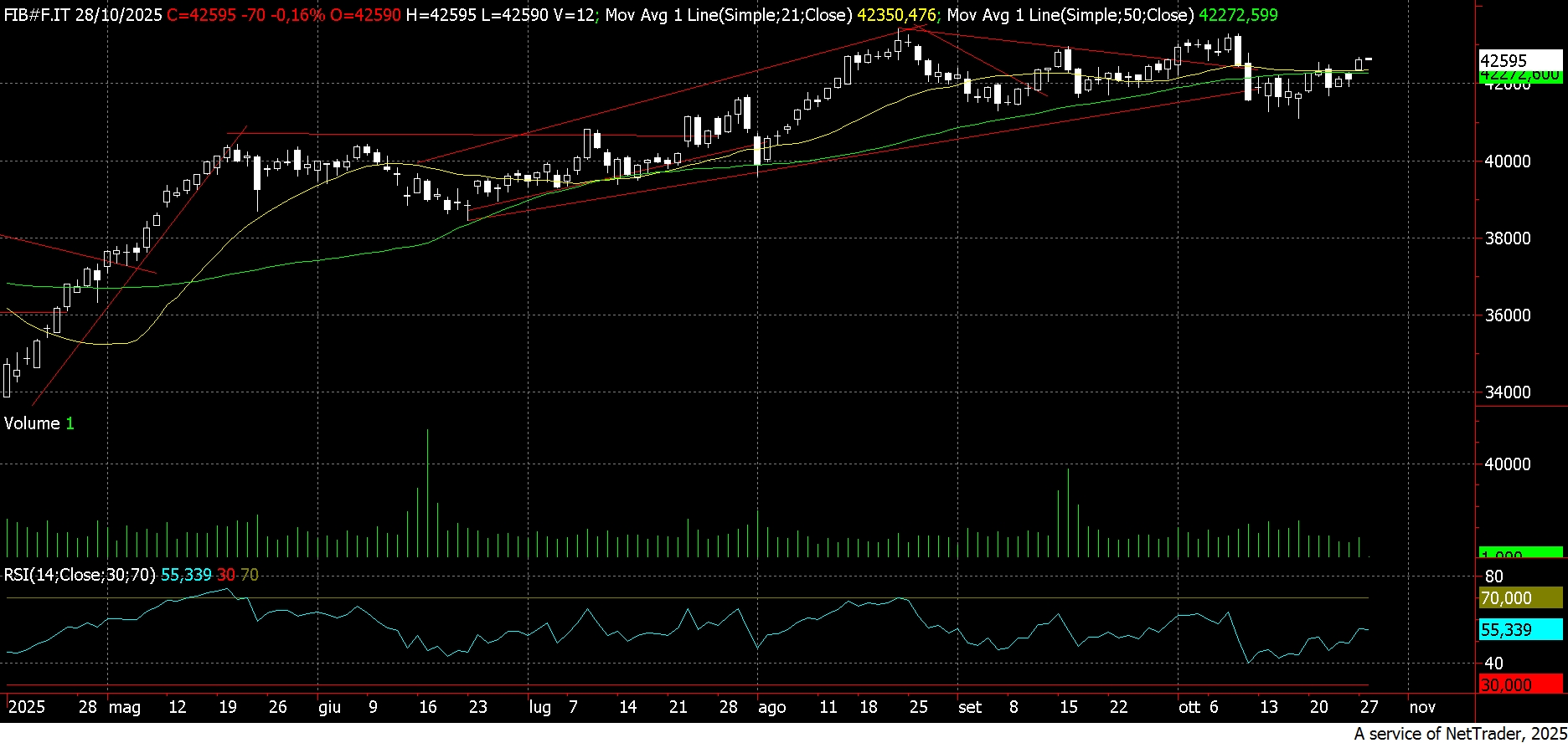 Il Fib, il future sull’indice Ftse Mib con scadenza dicembre, ha incrociato al rialzo le medie mobili a 21 e 50 sedute, rispettivamente passanti per 42.340 e 42.275 punti. Operativamente, al rialzo prossimi target a 43.420 prima e in area 44.000 nel caso in seguito. Sotto 41.670, per contro, obiettivi potenziali in zona 40.000 punti.