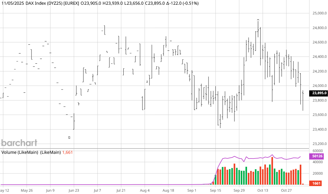 Il Dax future con scadenza dicembre ha confermato la violazione del supporto statico di breve termine a 23.795 punti. Una dinamica che potrebbe spingere i corsi al test del sostegno successivo in zona 23.545/23.400 punti. Oltre la soglia dei 24.000 punti, per contro, target potenziali in area 24.200.