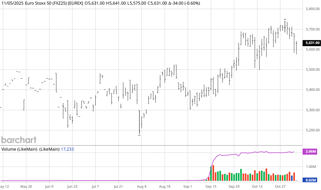 L’Euro Stoxx 50 future con scadenza dicembre ha violato nell’intraday di ieri la trendline ascendente passante per quota 5.585. Una violazione che, se confermata, favorirebbe lo sviluppo di un downtrend con primi target in area 5.500 punti. Oltre 5.655, per cpontro, obiettivi potenziali in zona 5.715/5.740.