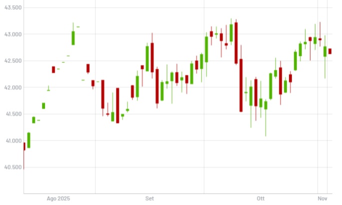 Il Fib, il future sull’indice Ftse Mib con scadenza dicembre, si sta muovendo lateralmente intorno ai 42.650 punti. Operativamente, al ribasso, primi obiettivi potenziali in zona 42.170/42.000 mentre oltre 42.975 i successivi target sono individuabili in prima battuta a quota 43.225.
