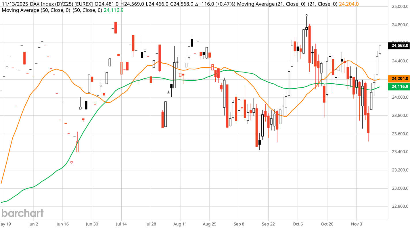Il Dax future con scadenza dicembre allunga ulterioriormente il passo superando anche la resistenza statica a 24.500 punti. Ora i prossimi obiettivi sono individuabili a 24.670 prima e in area 24.800/24.890 in seguito, eventualmente. Sotto 24.500, per contro, target potenziali in zona 24.000 prima e 23.800 nel caso poi.