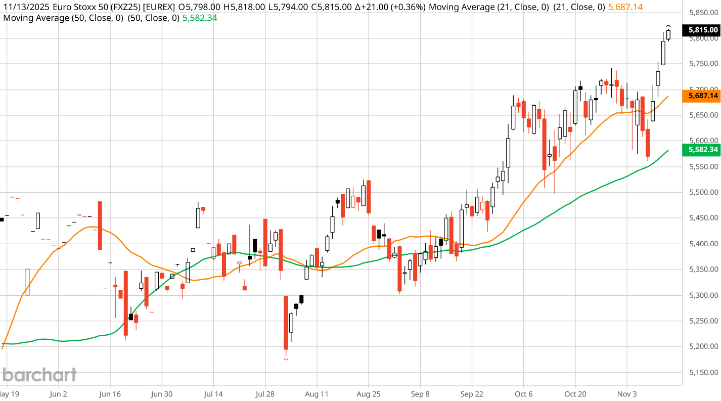 Aggiorna di nuovo massimo storico l’Euro Stoxx 50 future con scadenza dicembre, che vede ora nel mirino quota 5.850 con primo obiettivo, previo un possibile movimento laterale di consolidamento. Al ribasso invece il primo potenziale target è ora a quota 5.750.