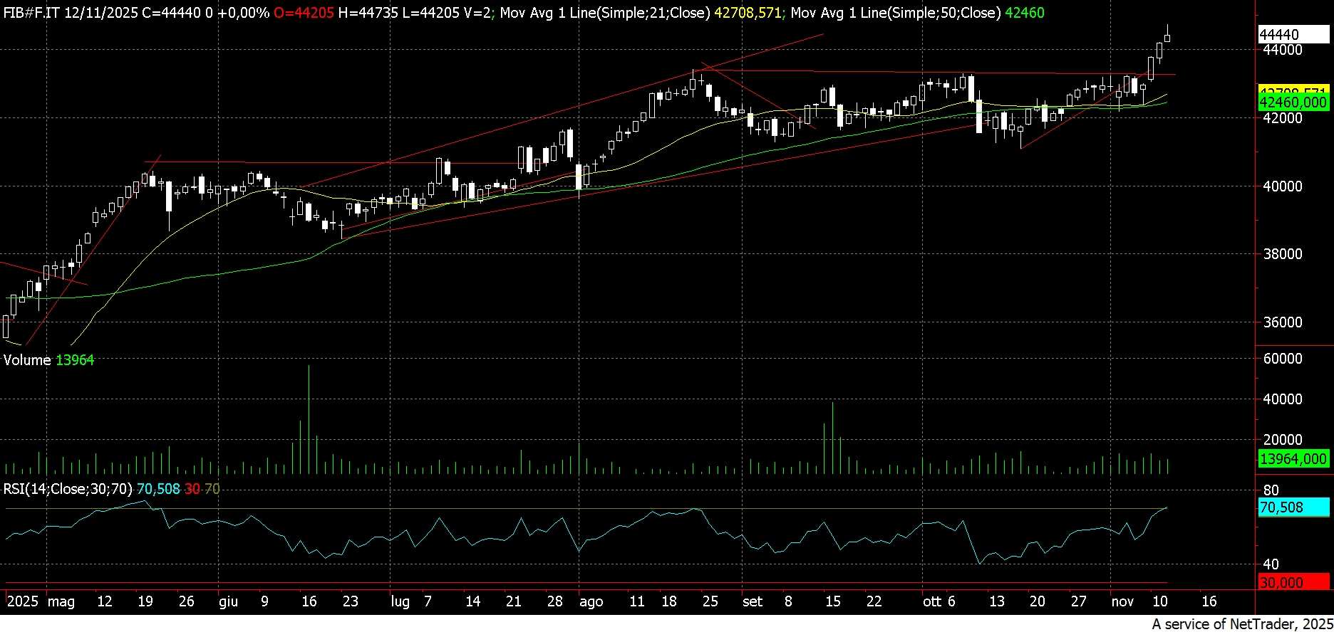 Quarta candela rialzista consecutiva ieri per il Fib, il future sull’indice Ftse Mib con scadenza dicembre, che ha registrato un nuovo top a 44.735 punti. Operativamente, al rialzo (dopo un eventuale fase laterale di consolidamento di breve periodo) i prossimi obiettivi sono individuabili in zona 44.500 prima e 44.750 nel caso poi. Per contro, sotto quota 44.000, il primo target diventerebbe 43.225 .